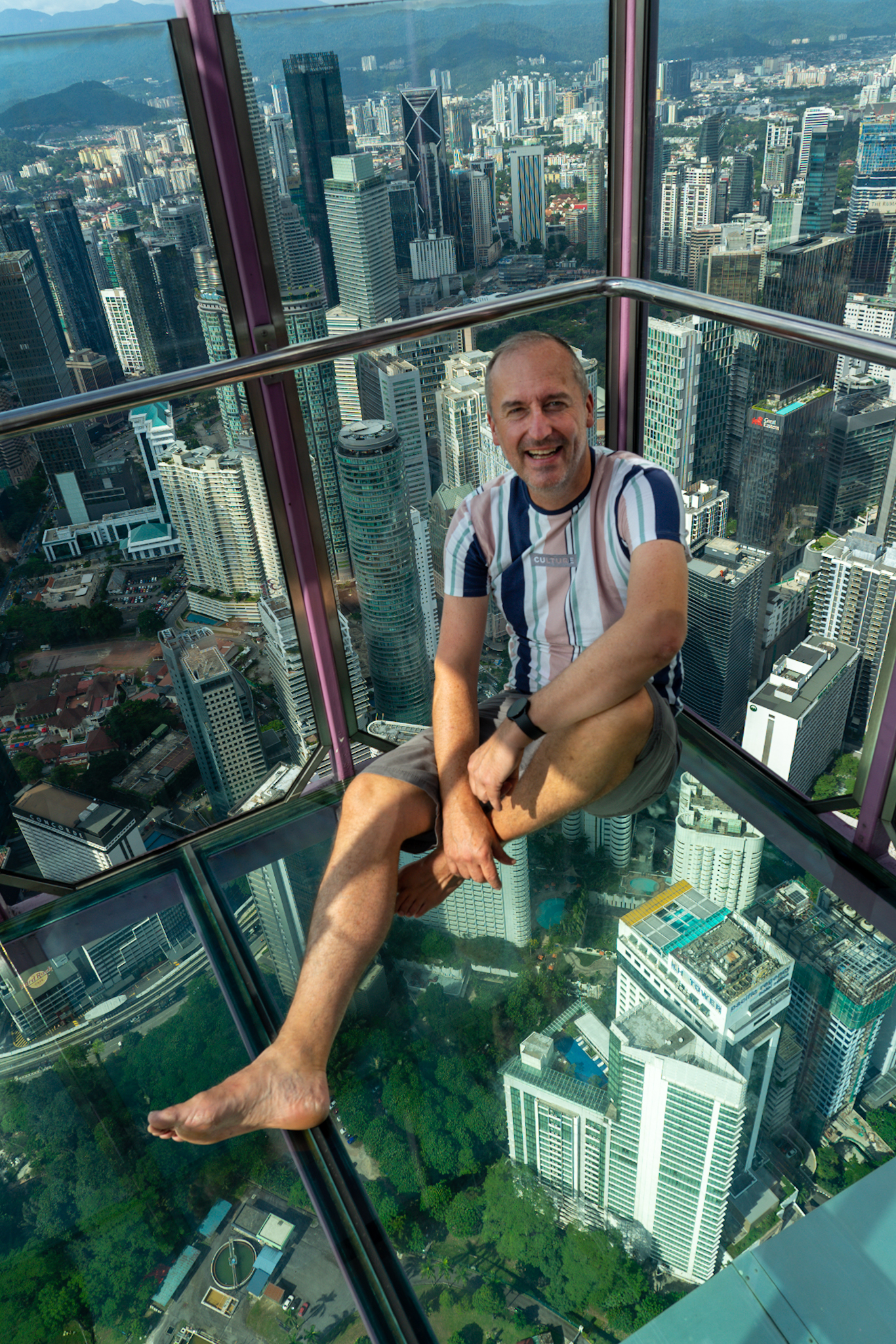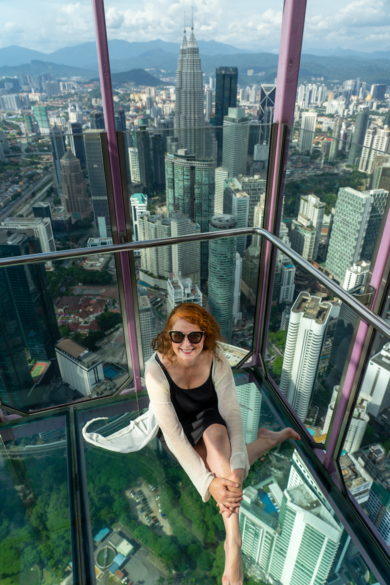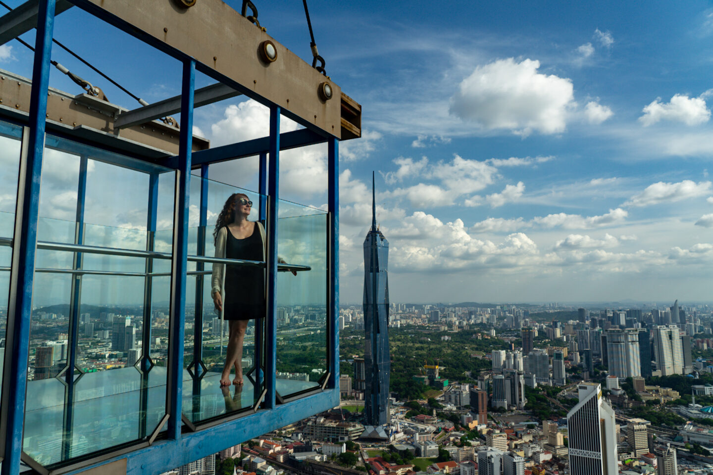 Den schönsten Blick von oben hat man vom KL Tower, dem 421m hohen Fernsehturm der Stadt. Hier gibt es als besonderes Highlight zwei „sky boxes“. Das sind Quader, komplett aus Glas, die 300m über dem Boden außen am Turm hängen. Nicht für jeden etwas, aber für spektakuläre Fotos nicht nur in der Instagram Gemeinde sehr beliebt. Wir hatten Glück: als wir dort oben waren, war nix los und wir konnten über die erlaubten 90 Sekunden hinaus in der Glaskiste bleiben.